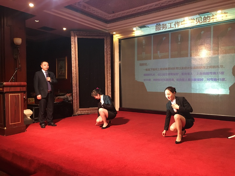 培訓在萬豪酒店服務人員表演的禮儀操中拉開序幕。這個表演由萬豪酒店馮國總經理策劃編排,根據實際工作經驗,將酒店服務人員接待時的禮儀規范動作融入輕快的音樂中,以富有活力的表演形式呈現出來,吸引了所有人的注意,同時引出此次培訓的主題——商務禮儀。
