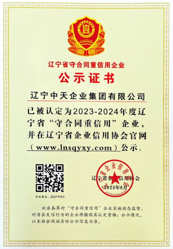 近日,中天集團憑借卓越的商業(yè)信譽和嚴謹?shù)穆募s能力,被遼寧省企業(yè)信用協(xié)會認定為2023-2024年度遼寧省“守合同重信用”企業(yè)和信用等級5A級企業(yè),這是集團自2005年以來連續(xù)20年獲此殊榮。這一榮譽不僅是對集團長期以來堅持誠信經(jīng)營的高度認可,更是對企業(yè)在打造品牌、服務(wù)社會方面不懈追求的充分肯定。